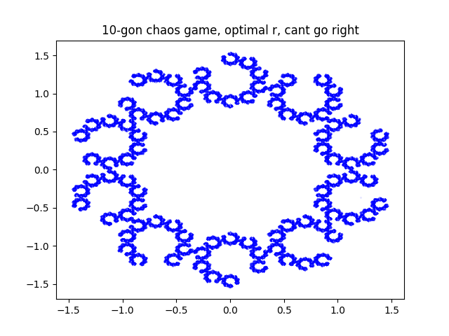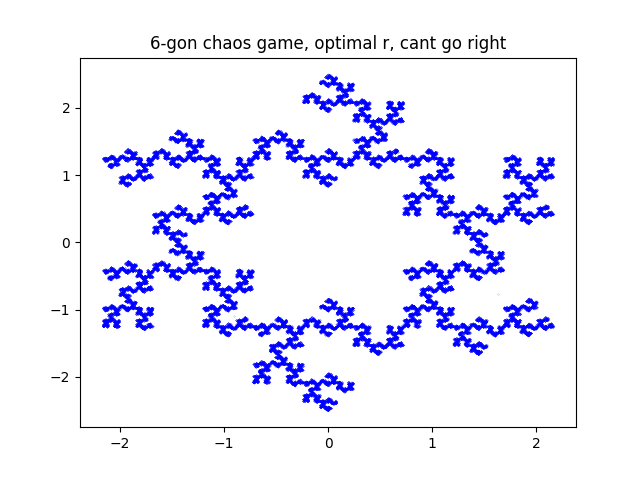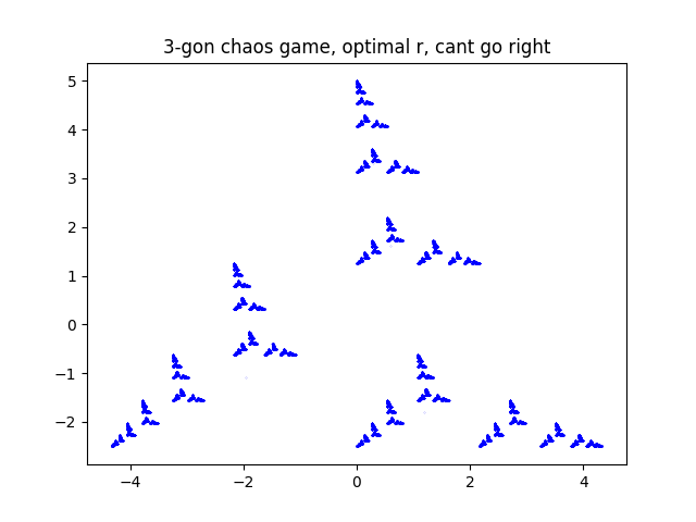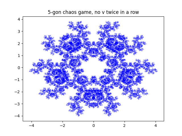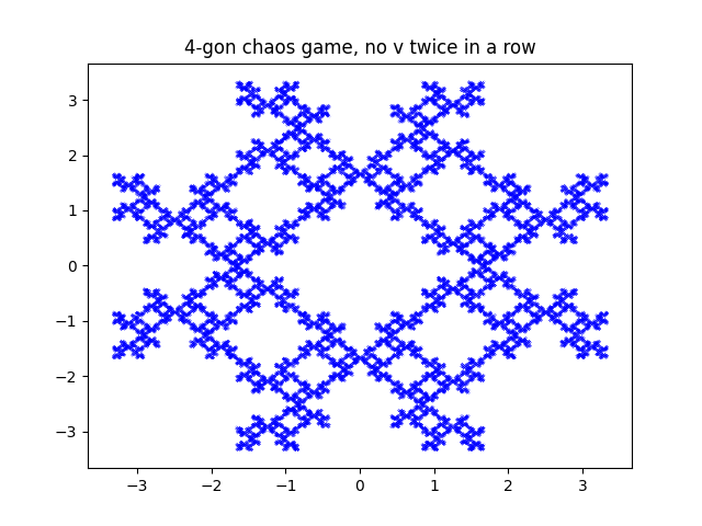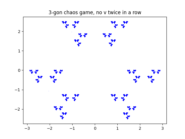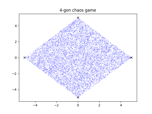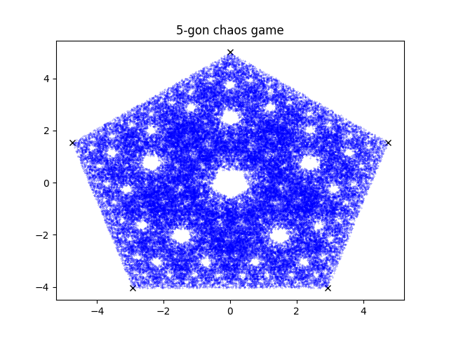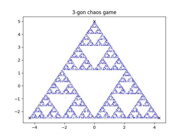 the chaos game is very simple. you have N vertices, normally arranged in a regular N-gon. each vertex is assigned a probability, lets say 1/N.