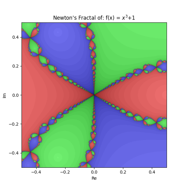 so for each point in the complex plane apply newtons method iteratively. this will end up at one the roots of the equation. if we give each root a colour and colour the plance depending on which root each point ended at.