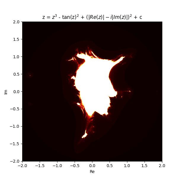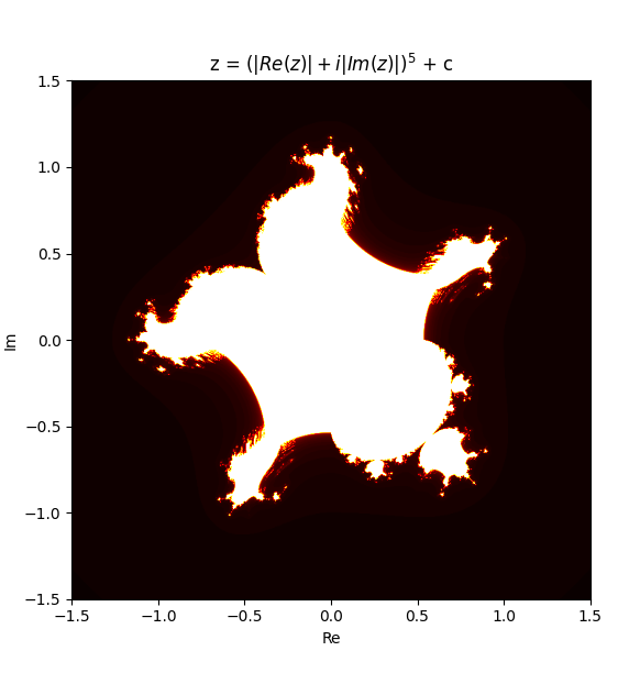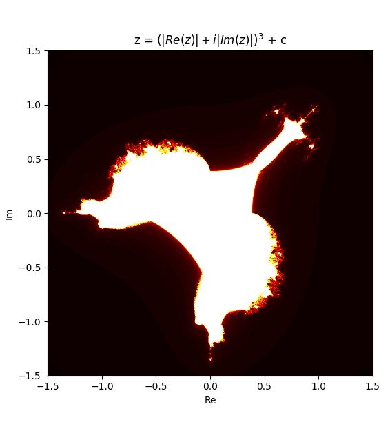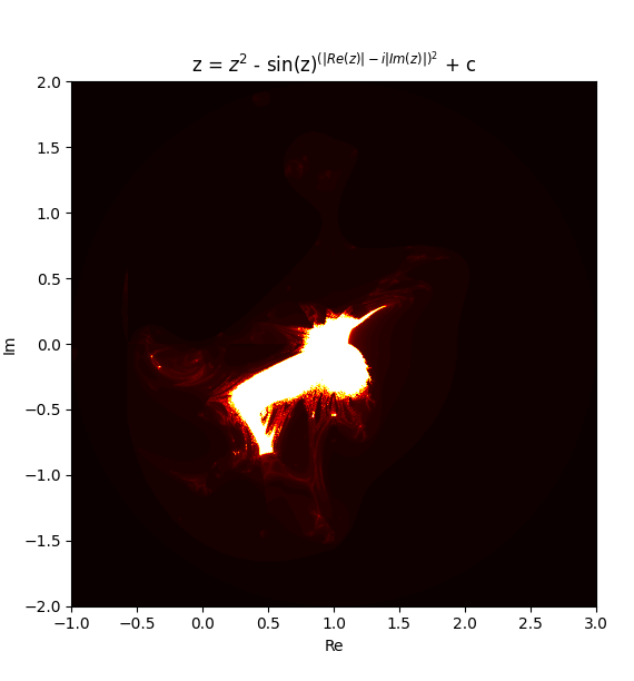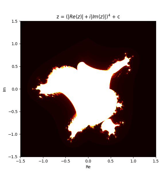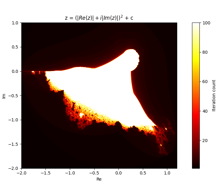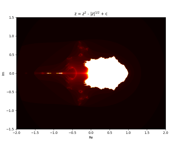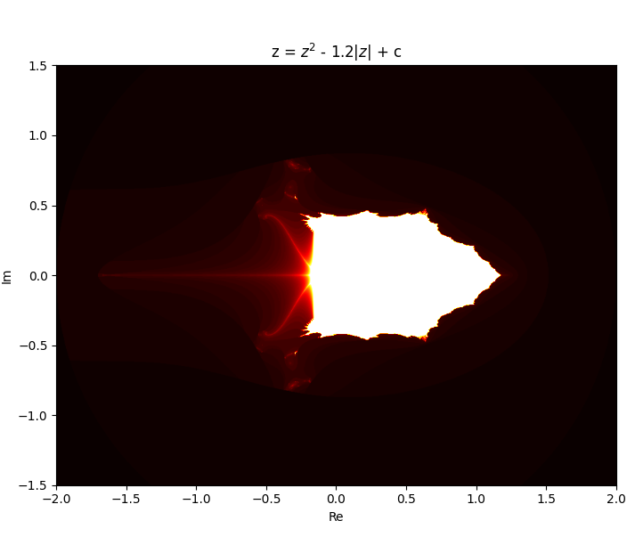 perhaps the best known of these is the burning ship fractal. it is generated by squaring the sum of the real and complex components of z. z = (Re(z) + Im(z)j)^2 + c